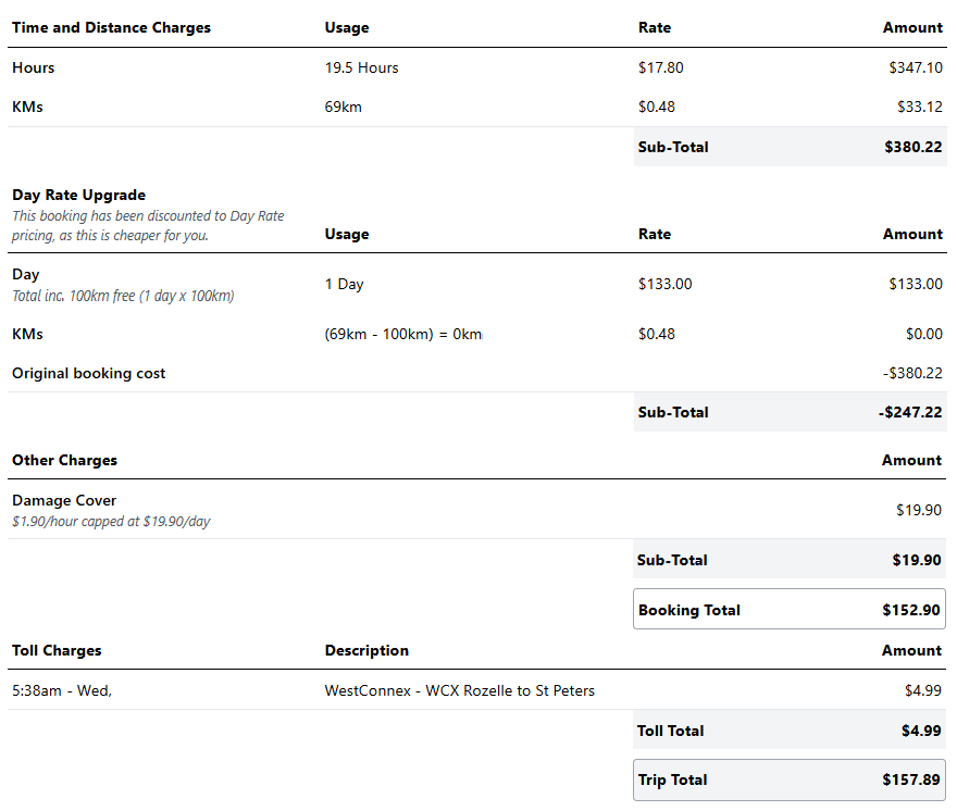 The final "Trip Total" is the cost of the entire booking. It includes the total for the Time and Distance Charges, the Day Rate Upgrade discount, as well any other charges (Reduced Damage Cover in this example) and any tolls.