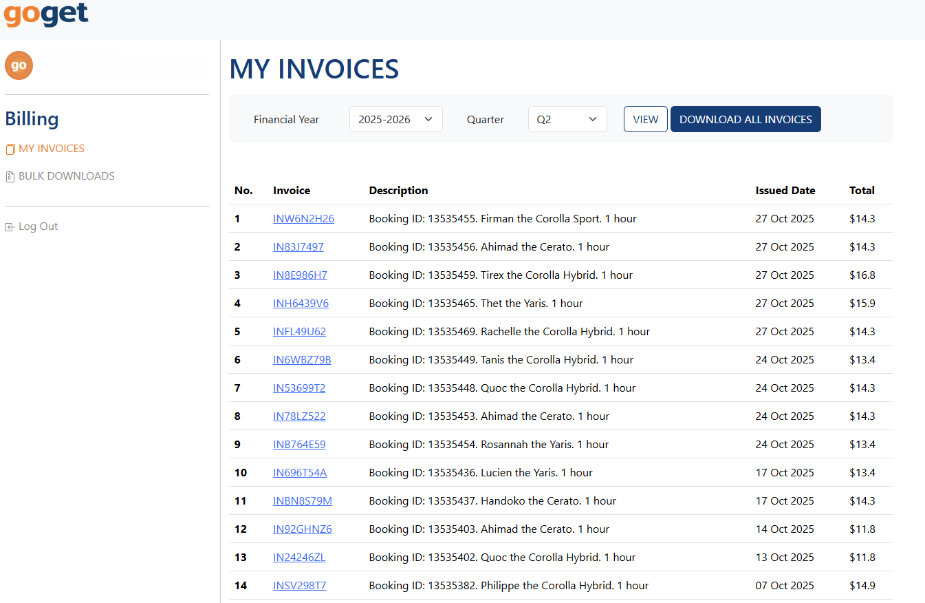 The Invoices page in the new app (which is being rolled out through January 2026) will show all of your GoGet invoices. If you are looking for a breakdown of all of the payments and transactions, please visit the account balance and transaction page.