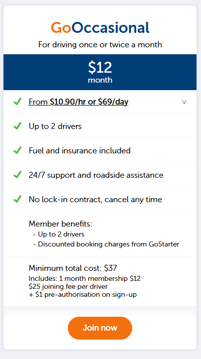 GoStarter $49 annual fee $12.90/hr or $110/day The pricing of the GoStarter Plan with a $49 annual membership fee |